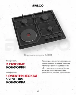 Эта модель объединяет три газовые конфорки и одну электрическую зону Hi-Light мощностью 1800W. Газ — для быстрого разогрева и жарки, электрическая зона — для равномерного нагрева и тушения.