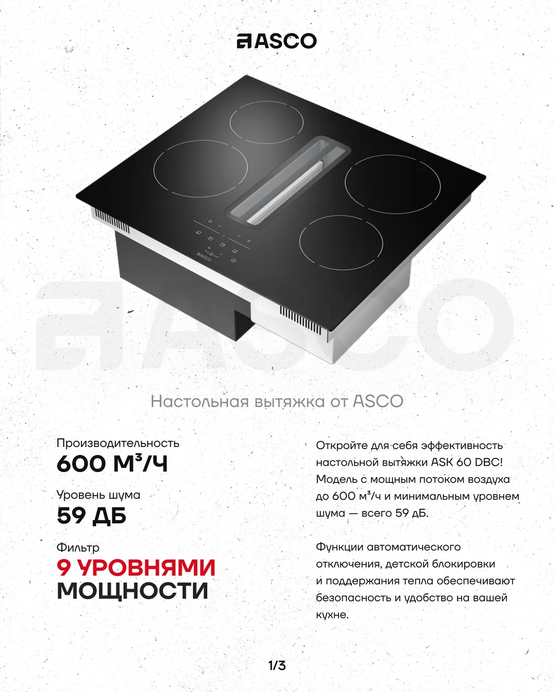 ASK 60 DBC Откройте для себя эффективность новой настольной вытяжки ASK 60 DBC! Модель с мощным потоком воздуха до 600 м³/ч и минимальным уровнем шума — всего 59 дБ.Стеклокерамическая плита …