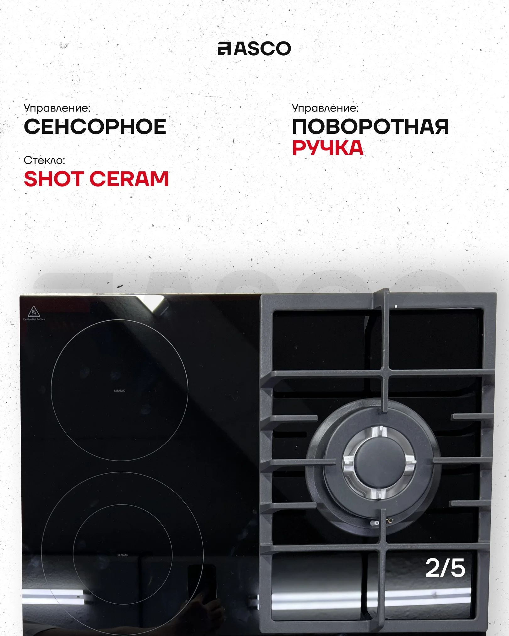 Элегантная встраиваемая газовая панель сочетает в себе мощную газовую конфорку 3,2 кВт и две керамические зоны нагрева (1800 Вт и 1200 Вт). Управление сенсором